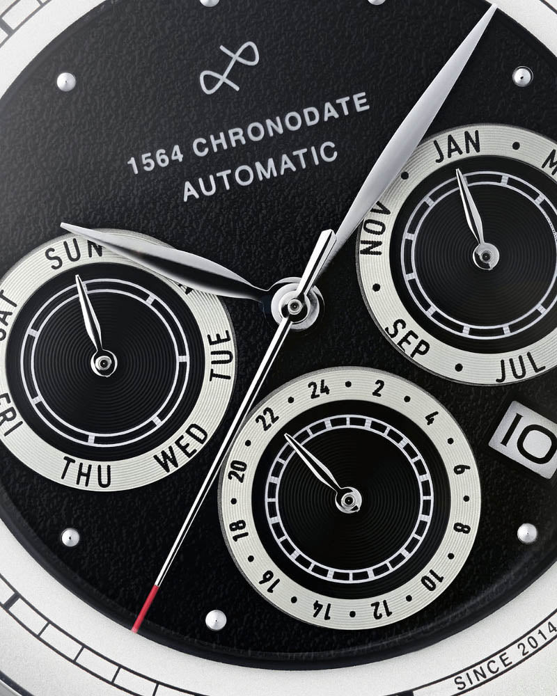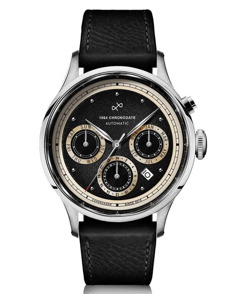 AV86 (formerly About Vintage) watches are designed in Denmark by Skov Anderson with the goal to create watches with contemporary simplicity and balance as key design elements, combined with classic vintage detailing. AV86 likes to name their watches with a reference to historical and memorable moments in horology. The 1564 Chronodate Automatic celebrates their first decade as a watch brand. The design balances vintage and contemporary elements, honoring their history while also looking forward.