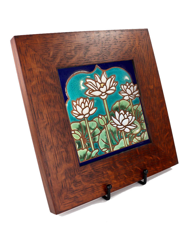 The hand glazed Lotus Field Ceramic Tile in Oak Frame is a unique work of art, with glaze variations that add to the distinctive beauty of each piece. Each tile is framed in a hand made quarter-sawn Oak Park frame with signature stain. Please note each frame will have a distinctive wood grain. The frame comes ready to hang with a keyhole notch. Due to the hand painted nature of these tiles, no two are exactly alike and variations are expected. Tile dimensions: 6" x 6". Framed dimensions: 9.5” x 9.5”. Ships in 5-10 days.