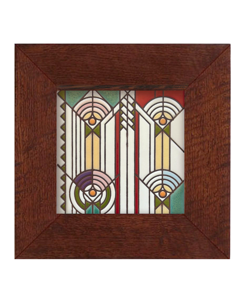 The hand glazed Frank Lloyd Wright April Showers Ceramic Tile by Carly Quinn is a unique work of art, with glaze variations that add to the distinctive beauty of each piece. Each tile is framed in a hand made quarter-sawn Oak Park frame with signature stain. Please note each frame will have a distinctive wood grain. The frame comes ready to hang with a keyhole notch. Due to the hand painted nature of these tiles, no two are exactly alike and variations are expected. Tile dimensions: 6" x 6". Framed dimensions: 9.5” x 9.5”.