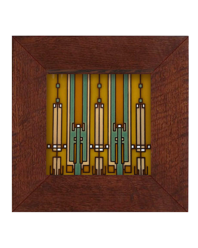 The hand glazed Frank Lloyd Wright Coonley House Ceramic Tile by Carly Quinn is a unique work of art, with glaze variations that add to the distinctive beauty of each piece. Each tile is framed in a hand made quarter-sawn Oak Park frame with signature stain. Please note each frame will have a distinctive wood grain. The frame comes ready to hang with a keyhole notch. Due to the hand painted nature of these tiles, no two are exactly alike and variations are expected. Tile dimensions: 6" x 6". Framed dimensions: 9.5” x 9.5”.
