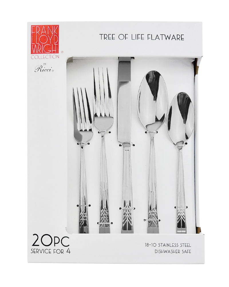 The Frank Lloyd Wright Tree of Life Flatware Set - Silver is adapted from the art glass windows in the Darwin D. Martin House (Buffalo, NY 1903-1905). The Frank Lloyd Wright Tree of Life Flatware Set features one of Mr. Wright’s most recognizable designs. This high quality 18/10 stainless steel set contains 4 full place settings including dinner knives, dinner forks, salad forks, place spoons & teaspoons.