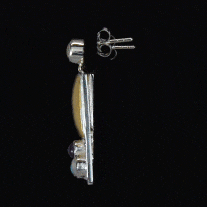 These Art & Design Josef Hoffmann Vienna Earrings are adapted from an original Josef Hoffmann design. Hoffman was one of the founders of Wiener Werkstätte (in translation Vienna Workshop), which starting in 1903 brought together designers and artists working in very different mediums including architecture, textiles, ceramics, furniture and jewelry. Sterling Silver Earrings with gold plate accents, set with Moonstone, Iolite, & Turquoise. Length 1.3". Coordinating necklace is also available.