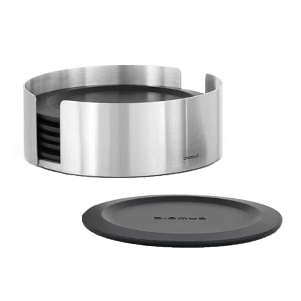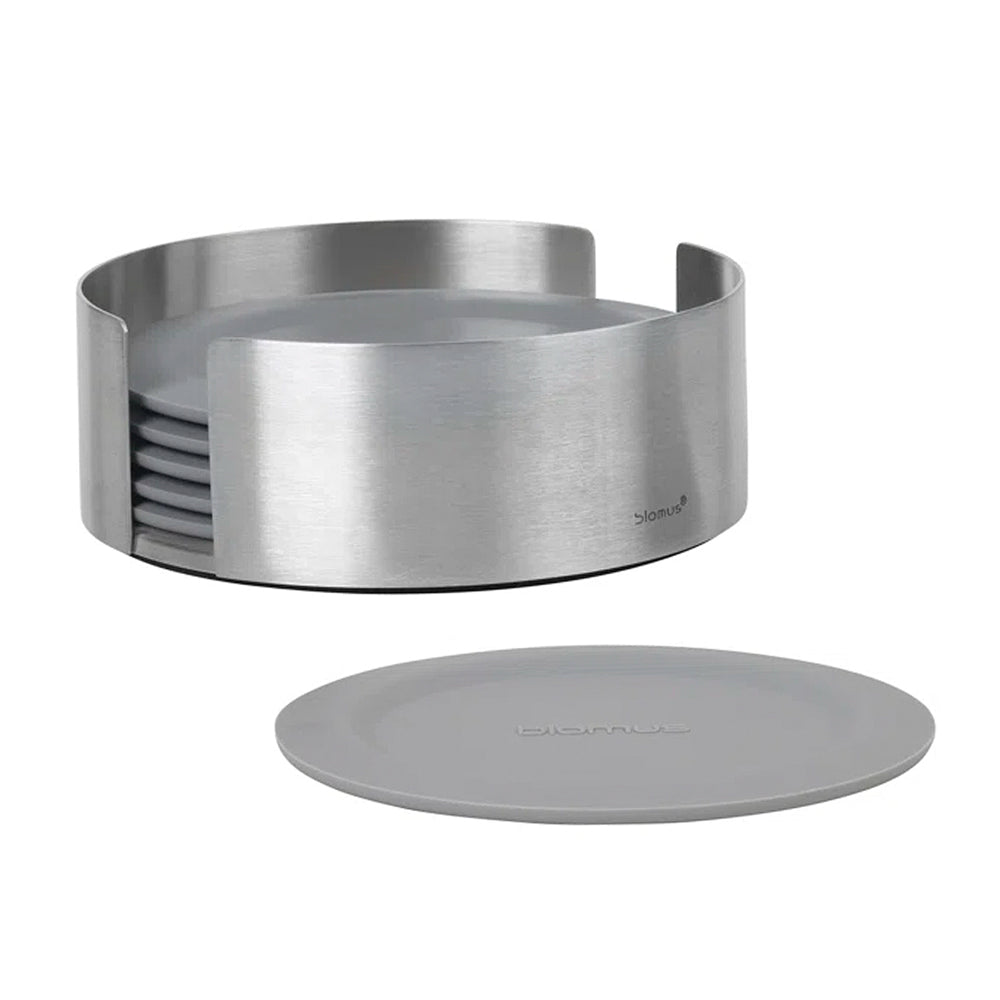 The Blomus Lareto Coasters with Stainless Steel Holder come as a set of 6 and are designed in a circular shape to accommodate glasses well. The silicone coasters are stored, ready to use, inside the 18/8 brushed stainless steel tray. Available in 4 colors: Magnet Charcoal, Moonbeam, Sharkskin, and Black. Dishwasher safe. Dimensions: 4.4" x 4.4" x 1.6".